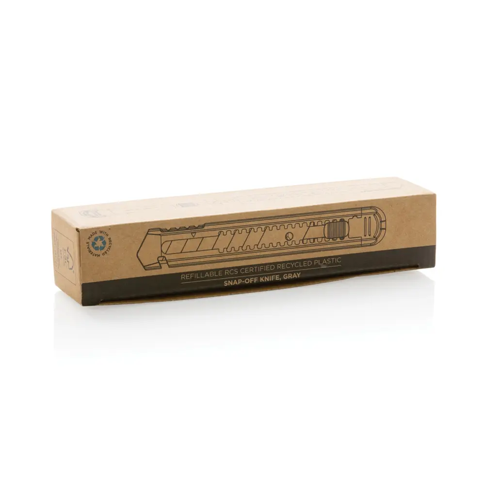 Découvrez notre cutter rechargeable, fabriqué en plastique recyclé certifié RCS avec 78 % de contenu recyclé, alliant ABS recyclé et lame en acier inoxydable. Idéal pour les entreprises et organisateurs d'événements, ce couteau polyvalent offre une lame amovible SK4 facile à remplacer, parfaite pour couper carton, plastique ou fines feuilles de métal avec précision et durabilité.