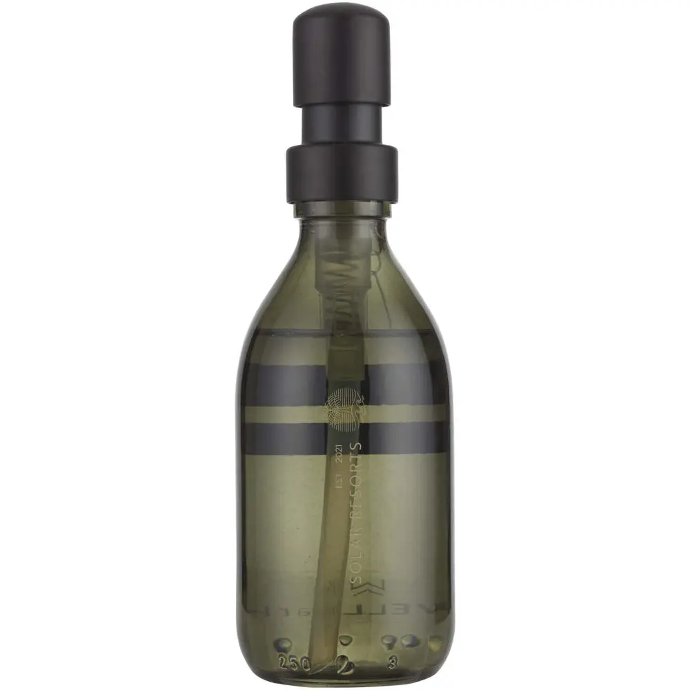 Personnalisez ce ensemble avec votre logo pour renforcer votre image de marque auprès de vos clients. Le distributeur de savon en verre de 250 ml, équipé d'une pompe pratique, est biodégradable et formulé sans parabènes, huile de palme, PEG, SLS ni SLES, garantissant une hygiène naturelle et respectueuse de l'environnement. Distribuez-le lors de salons ou comme cadeau client pour promouvoir des valeurs éco-responsables.