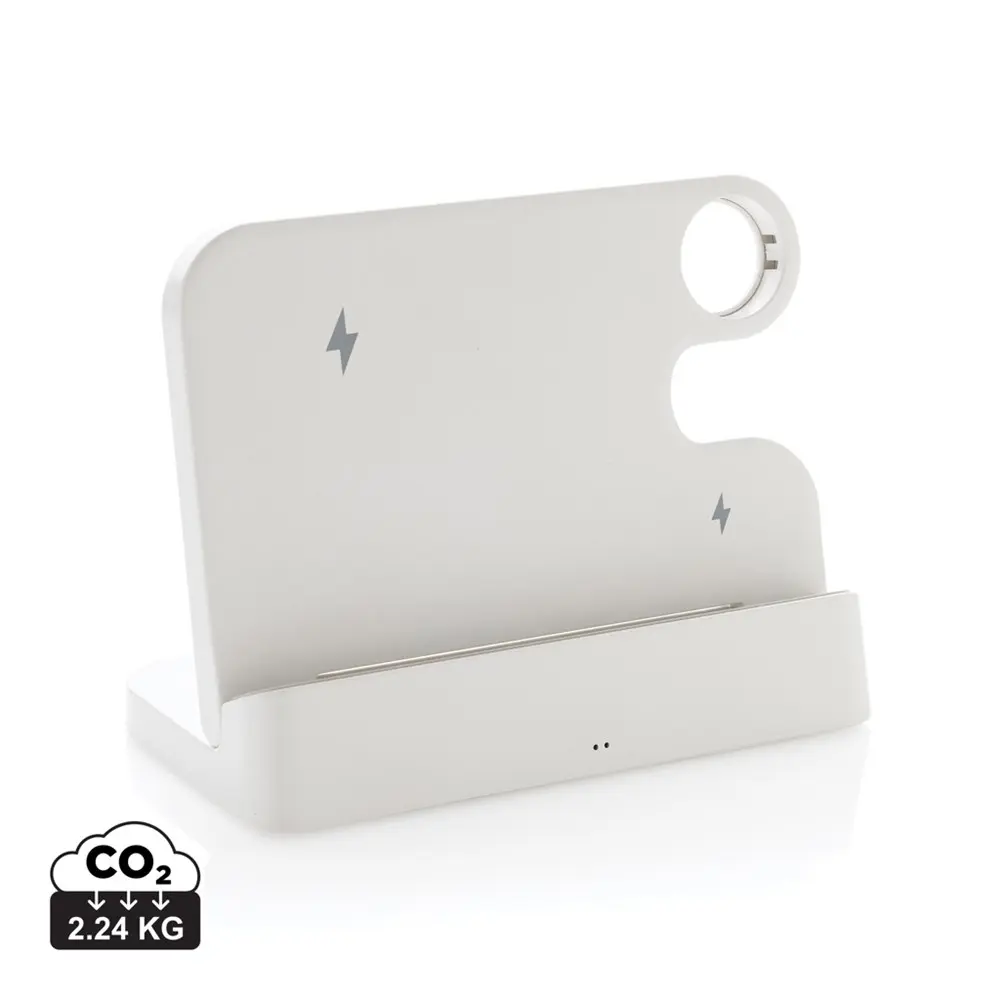 Découvrez notre support de chargement pliable multifonctionnel, idéal pour les entreprises cherchant des cadeaux promotionnels personnalisables. Équipé d'un chargeur sans fil 15W en ABS recyclé à 80 %, il recharge rapidement vos smartphones tout en protégeant l'environnement grâce à la certification RCS. Un second chargeur sans fil 5W est dédié aux écouteurs et petits appareils, tandis que l'emplacement dédié à l'iWatch permet une charge via le câble officiel.