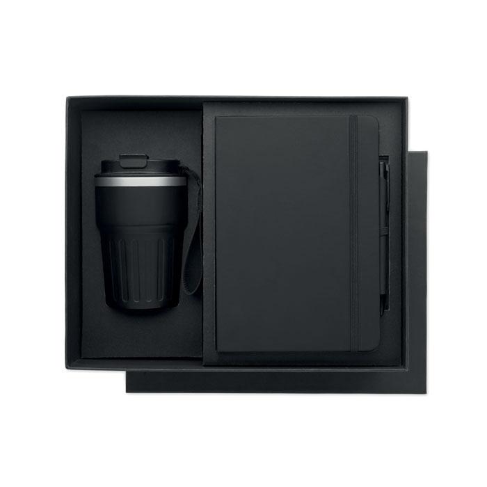 Découvrez ce coffret cadeau idéal pour vos actions promotionnelles et événements d'entreprise. Il contient un carnet A5 pratique, un stylo-bille en aluminium recyclé et un gobelet double paroi en acier inoxydable recyclé de 350 ml avec couvercle à glissière en PP et sangle, le tout présenté dans une élégante boîte cadeau.
