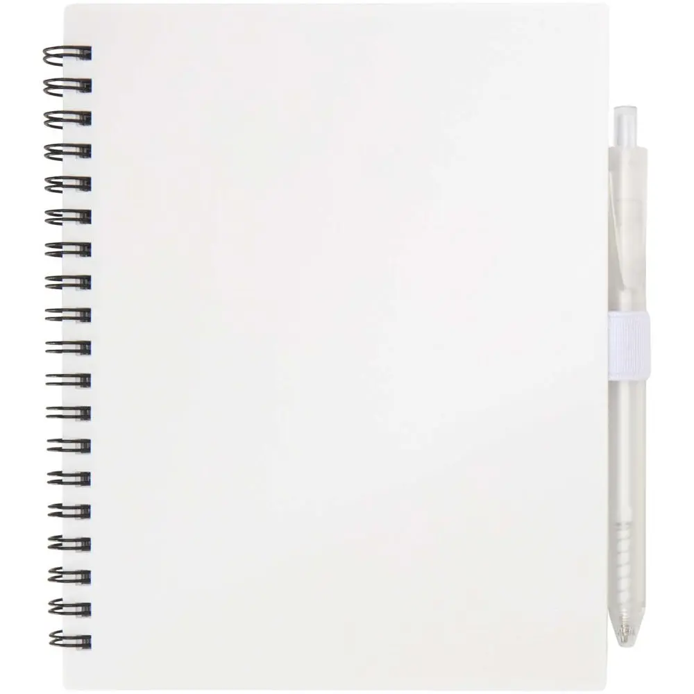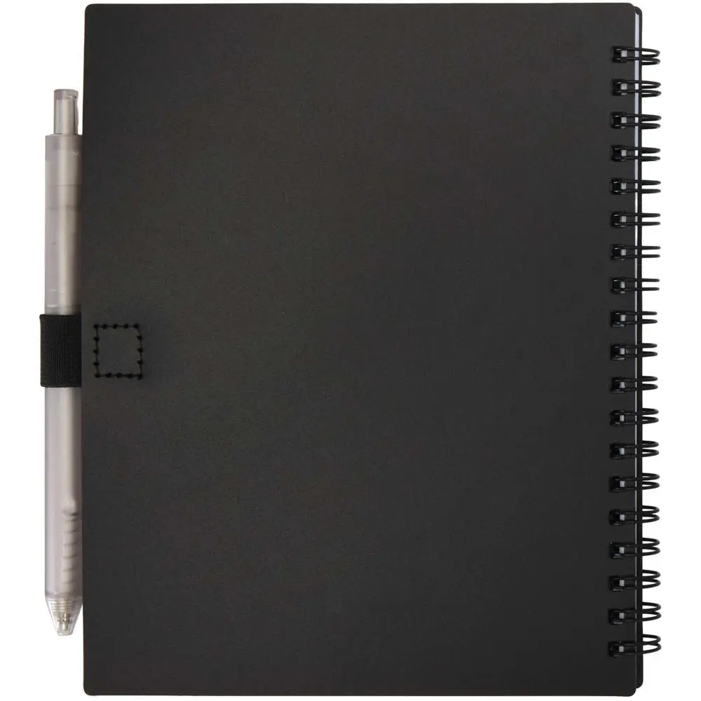 Le carnet présente une couverture souple en plastique recyclé, avec 70 feuilles pointillées de papier 70 g/m². Ses coins carrés et sa boucle pour crayon assurent une utilisation aisée au quotidien. Dimensions : 140 x 178 mm. Le stylo bille, également en plastique recyclé, offre une plume de 1,0 mm pour une écriture fluide et durable.