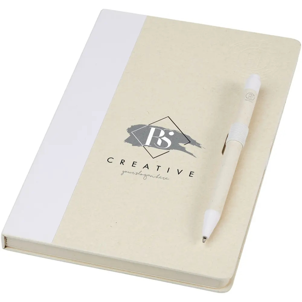 Découvrez l'ensemble Dairy Dream, un carnet de notes A5 et un stylo bille éco-responsables, idéaux pour vos campagnes marketing et événements d'entreprise. Fabriqués à partir de briques de lait recyclées jusqu'à 70 %, ils transforment les déchets en outils promotionnels durables. Le carnet offre 80 feuilles lignées de 80 g/m², avec spirales en papier et une boucle intégrée pour le stylo.