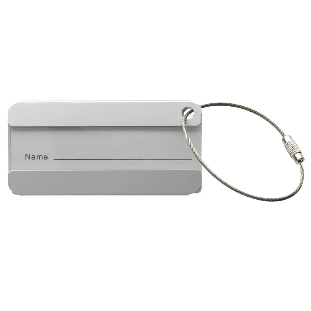 Découvrez notre étiquette à bagage rectangulaire en aluminium, idéale pour personnaliser avec votre logo d'entreprise. Dotée d'un anneau en acier robuste et d'un mécanisme de fermeture rotatif sécurisé, elle protège un papier blanc pour noter vos coordonnées, recouvert d'un plastique transparent résistant.
