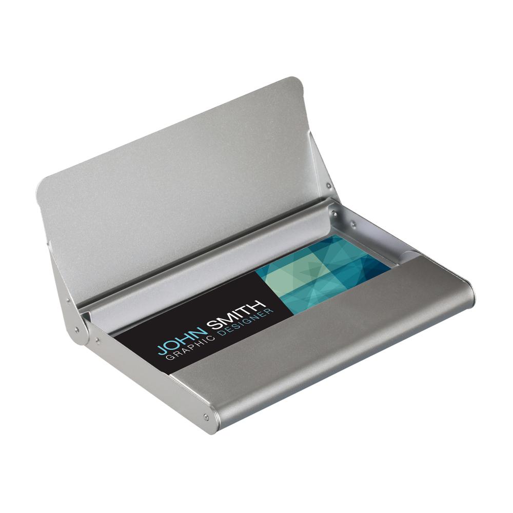 Découvrez cet étui à cartes de visite en métal léger, bien plus qu'un simple porte-cartes. Il se relève facilement pour devenir un présentoir élégant, idéal pour mettre en valeur vos cartes lors d'événements ou de rendez-vous professionnels.