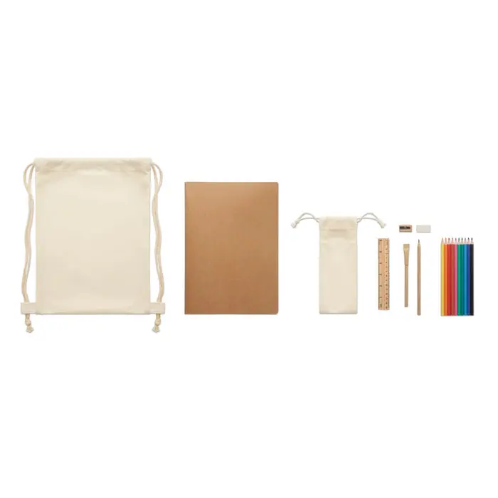 Cet ensemble comprend une règle en bois, un taille-crayon en bois, une gomme, un crayon en bois et un stylo à bille en carton. Il est enrichi de 10 crayons de couleur supplémentaires et de 50 feuilles de papier recyclé A4 (format simple, totalisant 100 pages). Tout est présenté dans un sac à cordon en coton, pratique et réutilisable.