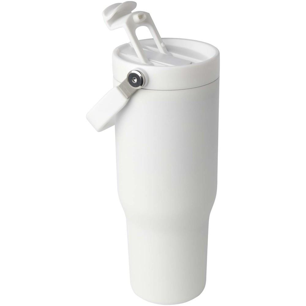 Le couvercle à double fonction facilite l'usage quotidien : une paille pliable pour boire sans effort et une ouverture à rabat avec poignée pliante pour un transport aisé. Avec un diamètre de 75 mm, il s'adapte parfaitement aux porte-gobelets de voiture, rendant ce cadeau promotionnel ultra-pratique.