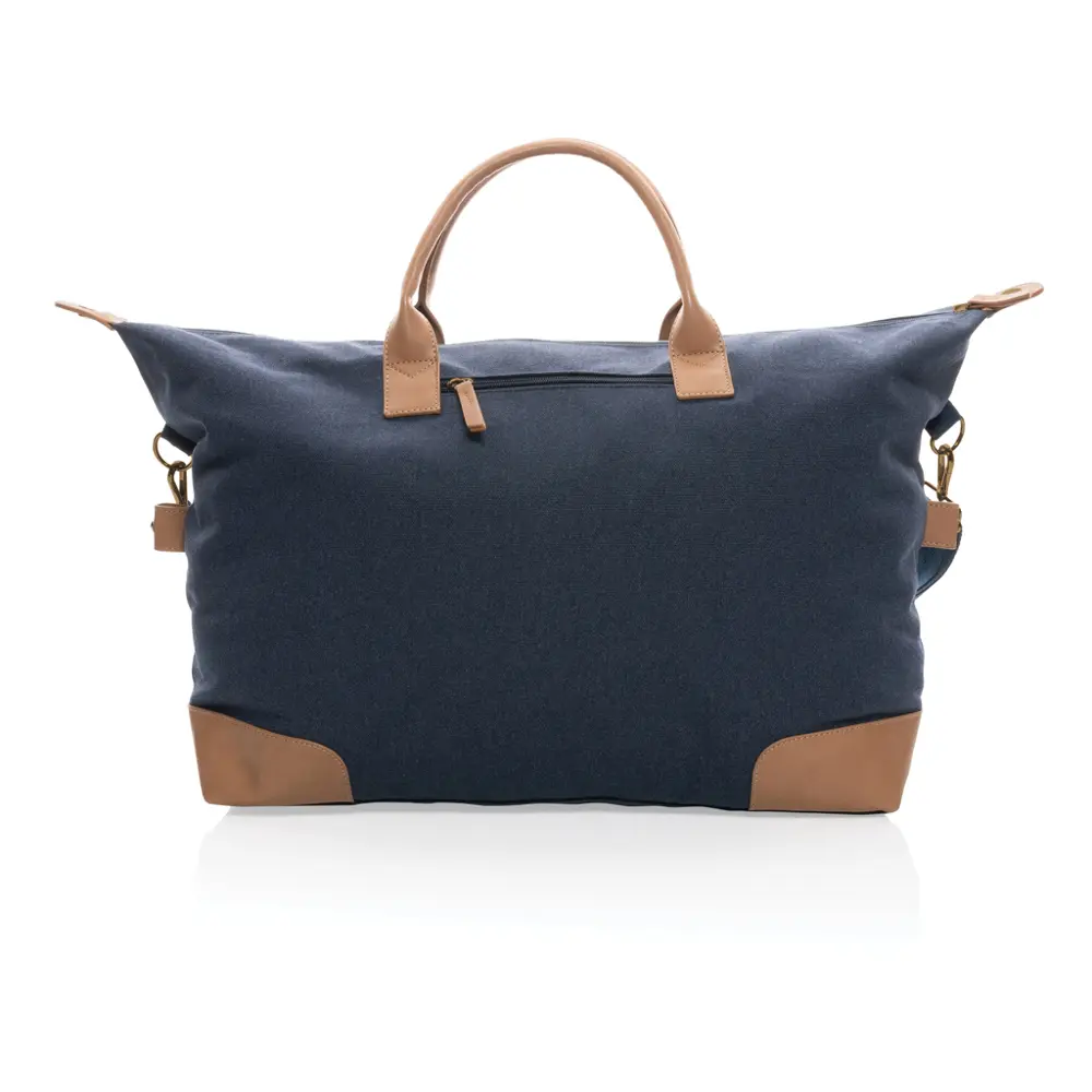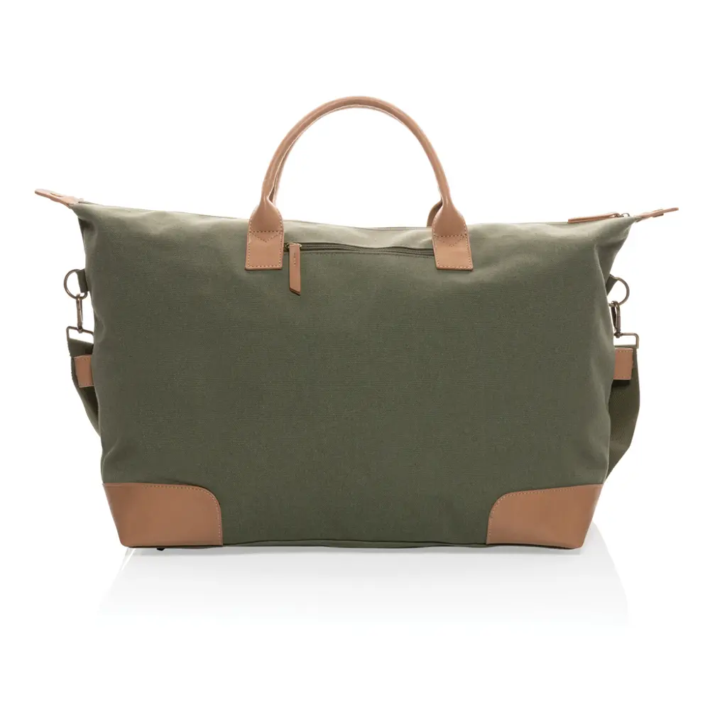 Découvrez notre grand sac weekend en toile, idéal pour vos campagnes promotionnelles et événements d'entreprise. Fabriqué à 60% en coton recyclé et 40% en polyester recyclé, avec doublure en polyester recyclé 150D, il offre un compartiment spacieux de 40 L, une poche avant pratique et des poignées en PU renforcées. Quatre clous en laiton protègent le bas du sac au sol, assurant propreté et durabilité.