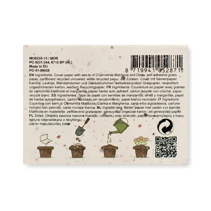 Découvrez le GROW ME - Bloc notes couverture à planter, un outil promotionnel innovant et écologique pour vos campagnes marketing. Fabriqué en papier d'herbe durable produit en Europe, ce bloc-notes comprend 50 et 25 feuilles repositionnables, idéales pour des notes adhésives pratiques comme les Post-it traditionnels, ainsi que 3 marque-pages en papier de culture.