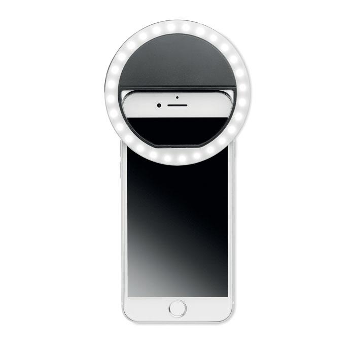 Découvrez la HELIE - Lampe portable pour selfie, un accessoire compact et circulaire de 8 cm en ABS, équipé de 28 LED pour un éclairage optimal. Avec sa lumière blanche réglable sur 3 niveaux de luminosité, elle garantit des selfies parfaits en toutes circonstances, idéale pour vos événements et promotions.