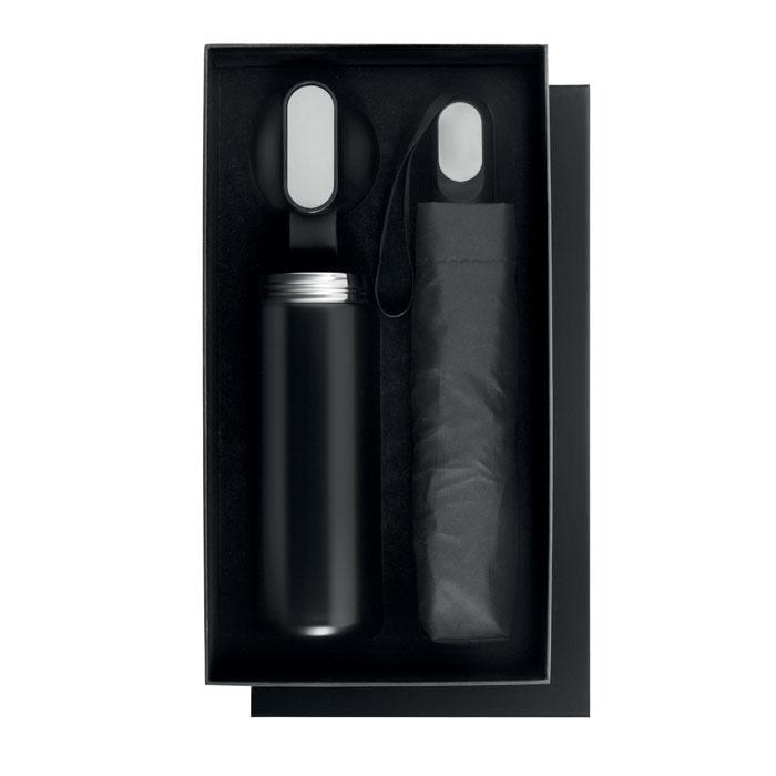 Offrez un coffret cadeau premium composé d'une bouteille isotherme en acier inoxydable recyclé (90 %) double paroi de 600 ml avec couvercle PP, détails en métal et poignée en silicone confortable, accompagnée d'un parapluie pliable de 21 pouces en pongé avec poignée en ABS robuste.