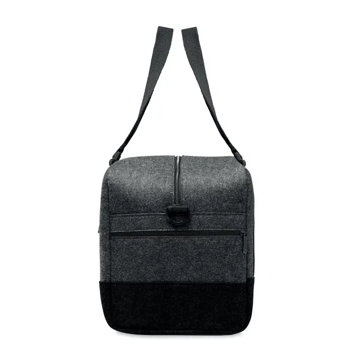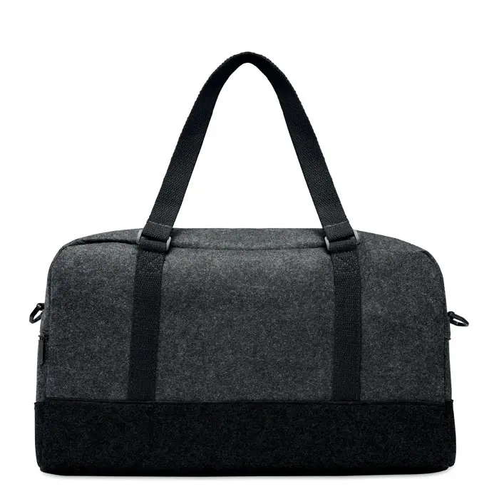 Découvrez notre sac de week-end en feutre RPET, idéal pour les déplacements sportifs, fitness ou escapades courtes. Conçu avec une poche frontale zippée pour un accès rapide à vos essentiels, des poignées robustes en toile pour un transport facile, et une bandoulière réglable amovible pour un confort optimal.