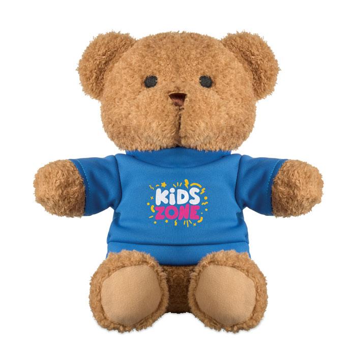 Découvrez cet adorable ours en peluche de 23 cm, vêtu d'un t-shirt personnalisable. Parfait pour les entreprises et organisateurs d'événements, il offre une surface idéale pour une impression par sublimation de votre logo ou message promotionnel.