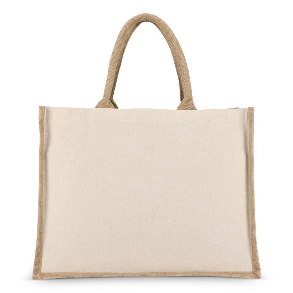 Découvrez notre sac fourre-tout Jute-Cotton, fabriqué avec des panneaux avant et arrière en toile de coton naturel et des côtés et un fond en jute robuste, le tout en 320 g/m² pour une grande durabilité. Les poignées en coton assurent un confort optimal et un look naturel et unifié.