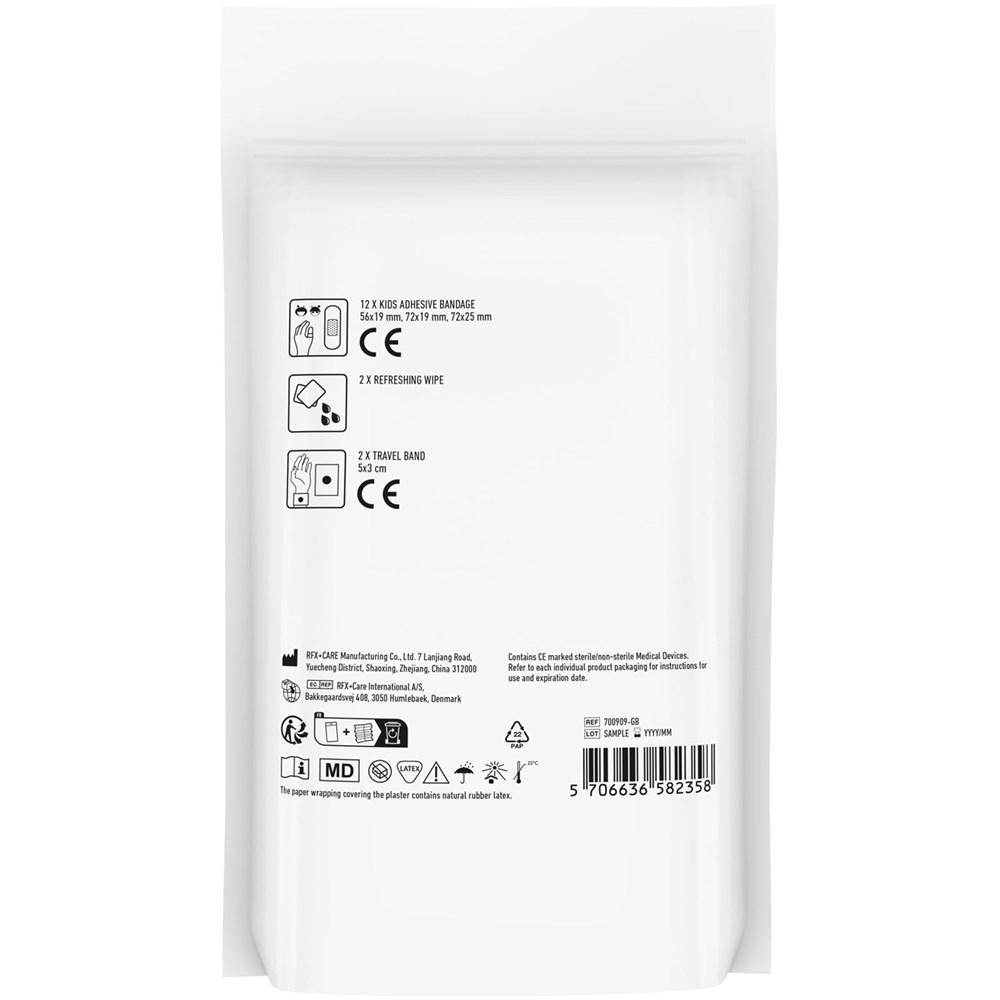 Ce kit contient 12 pansements adaptés aux enfants, 2 lingettes rafraîchissantes et 2 bracelets anti-mal de transport, tous conformes aux normes européennes de premiers secours. Parfait pour les marketing professionals et event organizers, il offre une solution pratique et sécurisée à distribuer lors d'événements ou comme cadeau promotionnel personnalisé avec votre logo.