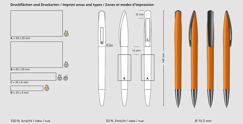 Produit en Europe, ce stylo allie robustesse et fiabilité avec des matériaux de qualité : plastique et métal pour une longévité accrue. Dimensions compactes (146 mm de longueur, diamètre de 10,5 mm) le rendant facile à transporter. La mine standard Silktech L offre une écriture lisse sur 3 000 mètres, avec options pour une personnalisation avancée.