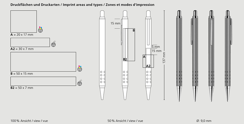 Fabriqué en Europe, ce stylo allie robustesse et finition soignée. Son corps en aluminium laqué assure une prise en main confortable, tandis que les éléments en laiton chromé brillant et clip en acier à ressort confèrent une apparence premium. Mesurant 137 mm de longueur pour un diamètre de 9 mm, il est compact et pratique, parfait pour des commandes en grandes quantités destinées à vos partenaires ou clients.