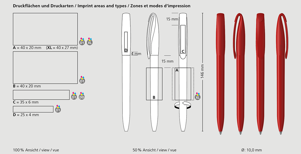 Mesurant 146 mm de longueur et 10 mm de diamètre, ce stylo s'adapte parfaitement à la main, facilitant son transport et son utilisation lors de salons ou distributions promotionnelles.