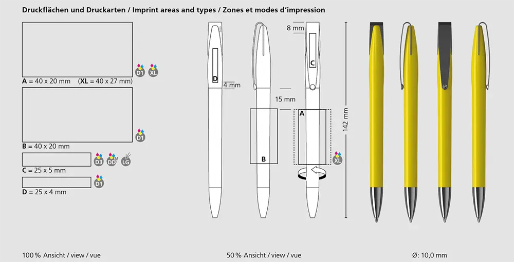 Avec une longueur de 142 mm et un diamètre de 10 mm, ce stylo offre une prise en main confortable et ergonomique. Sa taille compacte le rend facile à transporter et à distribuer en grand nombre lors de vos manifestations professionnelles.