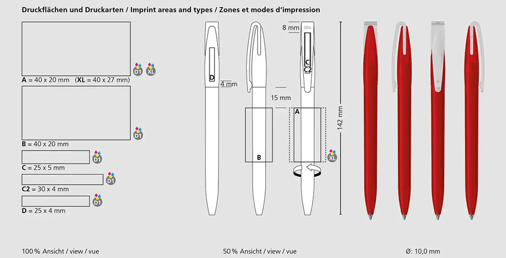 Avec une longueur de 142 mm et un diamètre de 10 mm, ce stylo s'adapte parfaitement à la main, facilitant son utilisation lors d'événements ou en distribution publicitaire. Compact et léger, il est facile à transporter et à offrir.