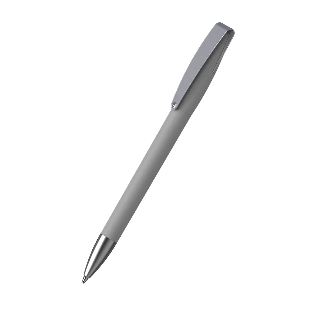 Le corps et la partie supérieure présentent une surface laquée en softgrip pour un confort optimal lors de l'écriture prolongée. La pointe en laiton chromé assure une précision remarquable, tandis que le clip en acier à ressort chromé mat offre une fixation sécurisée. Ces matériaux robustes en plastique et métal garantissent une longévité exceptionnelle, parfait pour des distributions en grand volume lors d'événements ou de campagnes marketing.