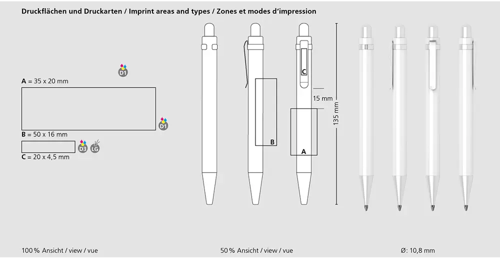 Avec une longueur de 153 mm et un diamètre de 10,8 mm, ce stylo offre une prise en main confortable, adapté à une utilisation prolongée. Son design ergonomique s'intègre parfaitement dans la poche ou la main, favorisant une expérience utilisateur optimale lors de vos salons ou rencontres professionnelles.