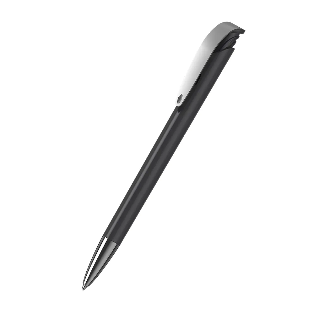 Fabriqué avec un corps et un poussoir en plastique ABS opaque brillante, une pointe en laiton nickelé et un clip en acier à ressort nickelé, ce stylo garantit une excellente durabilité. Produit en Europe, il respecte des standards élevés de qualité, assurant une longue durée d'utilisation pour vos clients finaux.