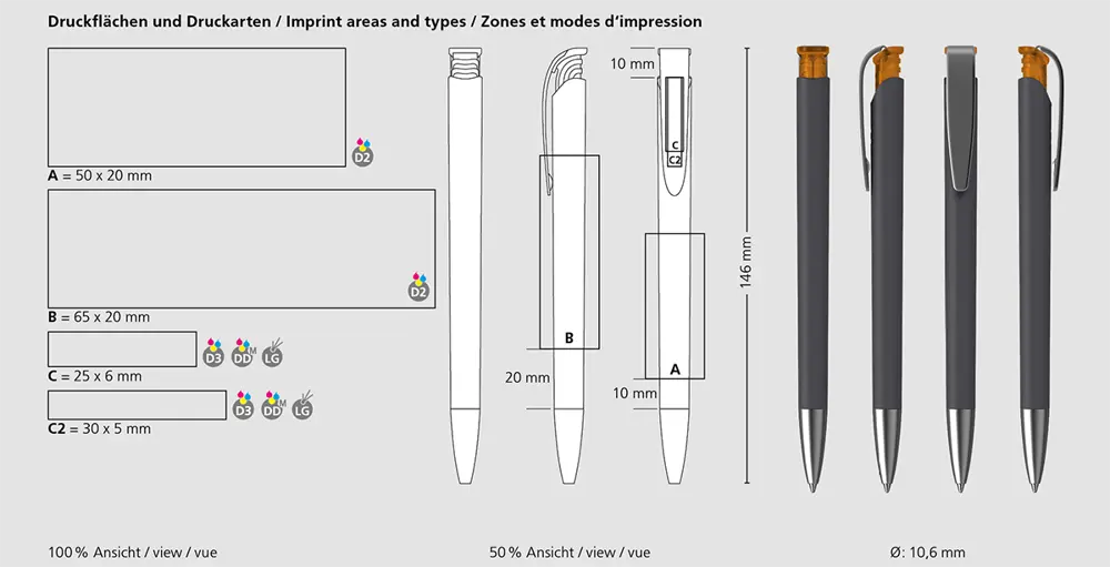Dimensions pratiques (146 mm de longueur, Ø 10,6 mm) pour une prise en main facile. Boostez votre visibilité marketing avec cet outil fiable et élégant.