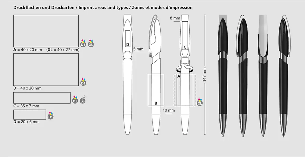 Personnalisez-le facilement avec votre logo pour renforcer votre marque lors d'événements ou comme cadeau publicitaire. Fabriqué en Europe, ce stylo durable (147 mm / Ø 11,1 mm) garantit qualité et fiabilité en grandes quantités. Idéal pour les professionnels du marketing et organisateurs d'événements cherchant à fidéliser leur clientèle avec un outil promotionnel sophistiqué et pratique.