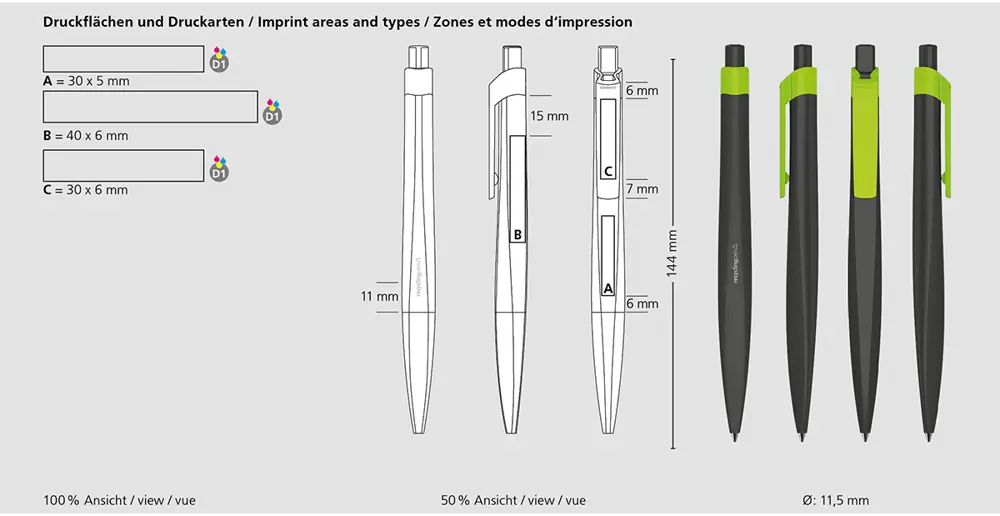Fabriqué à partir de plastique recyclé (rABS) pour le corps, la pointe, la manchette, le clip et le poussoir, avec un mécanisme en rPOM et des tubes de recharge en rPP. Ce choix écologique réduit l'impact environnemental tout en maintenant une qualité supérieure, démontrant l'engagement de votre entreprise envers la durabilité.