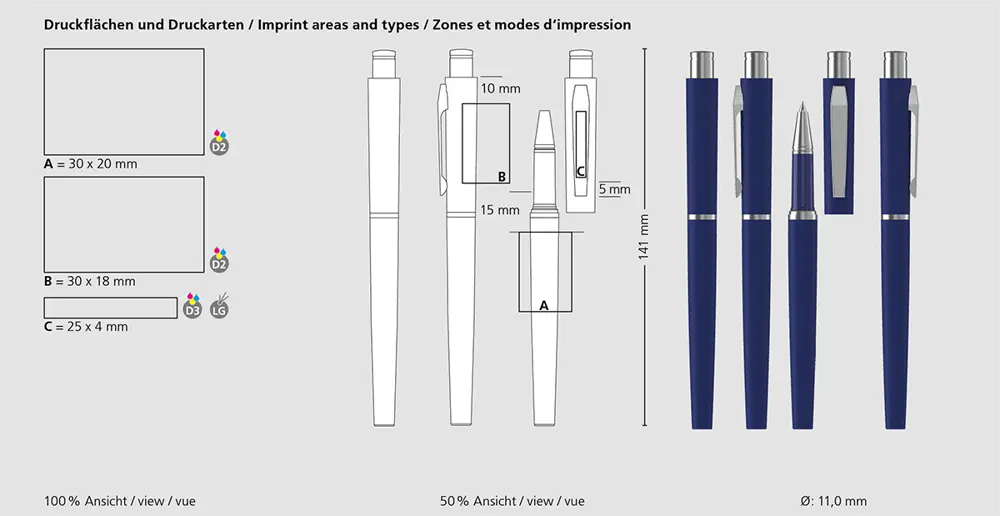 Mesurant 141 mm de longueur et 11 mm de diamètre, ce rollerball s'adapte parfaitement à la main pour une écriture fluide et précise. Sa taille compacte le rend facile à transporter et à distribuer lors d'événements.