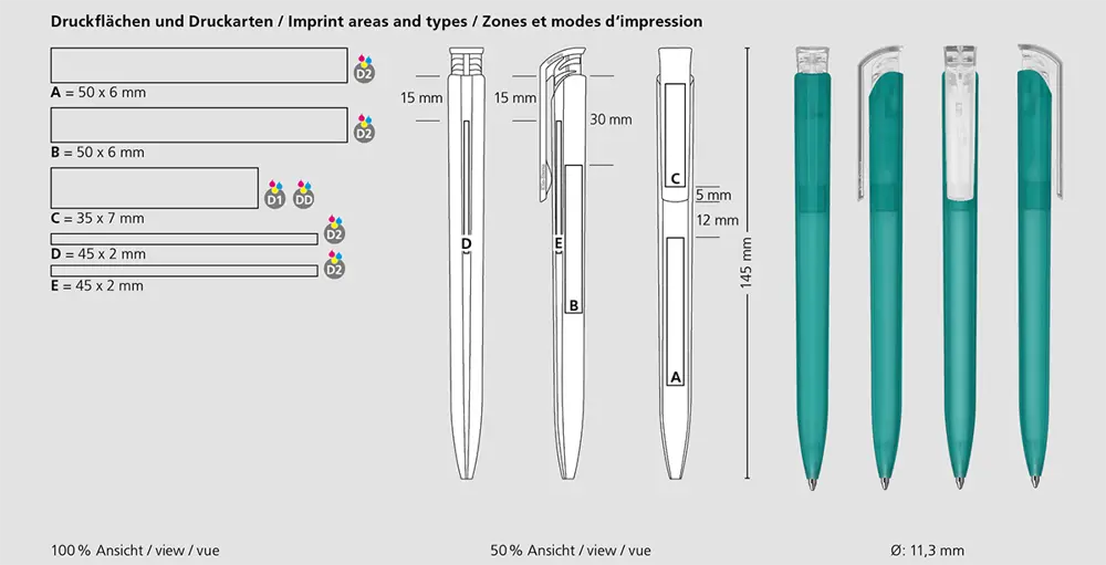 Avec une longueur de 145 mm et un diamètre de 11,3 mm, ce stylo s'adapte parfaitement à une impression de logo précise. Sa taille compacte le rend pratique à transporter et à distribuer en grande quantité lors de salons ou de rendez-vous professionnels.
