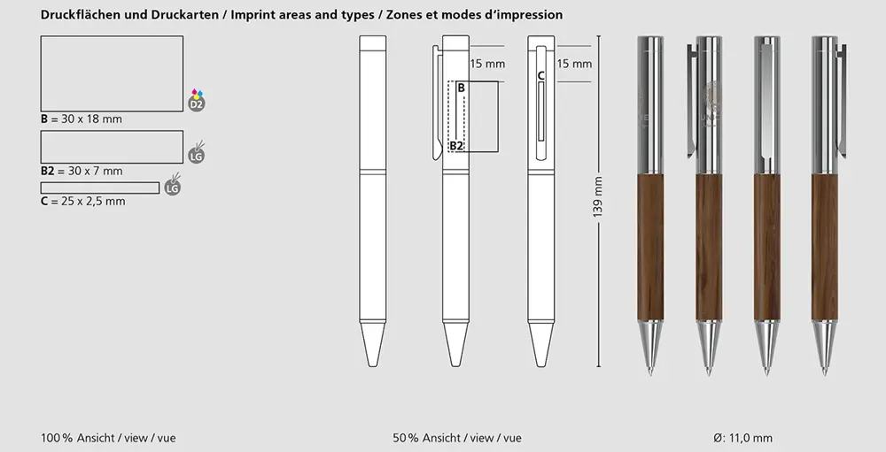 Ce stylo offre un mécanisme pivotant fluide pour une écriture précise et confortable, avec une mine longue durée assurant jusqu'à 8 000 mètres d'écriture. Son corps en bois noble et ses accents en métal confèrent une sensation premium, renforçant l'image de votre entreprise. Personnalisable en grandes quantités, il devient un vecteur efficace de visibilité, fidélisant vos interlocuteurs grâce à son aspect raffiné et sa robustesse quotidienne.