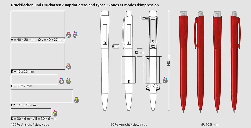 Ce stylo promotionnel se distingue par sa fabrication en Europe, garantissant une qualité européenne reconnue et une durabilité accrue. Sa structure en plastique transparent (M-ABS) permet une personnalisation facile avec votre logo, renforçant la visibilité de votre marque lors d'événements ou de distributions. Les dimensions compactes (148 mm de longueur et 10,5 mm de diamètre) en font un outil léger et pratique à transporter, idéal pour des commandes en grandes quantités.