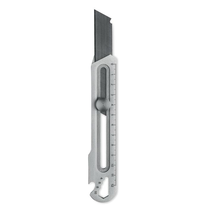 Découvrez ce cutter rétractable multi-outils en acier inoxydable, idéal pour les campagnes promotionnelles et les événements d'entreprise. Équipé de 8 lames en acier carbone ultra-résistantes et interchangeables pour des découpes précises et durables, il intègre également un décapsuleur, une clé à molette et une règle intégrée, transformant cet outil en compagnon polyvalent au quotidien.