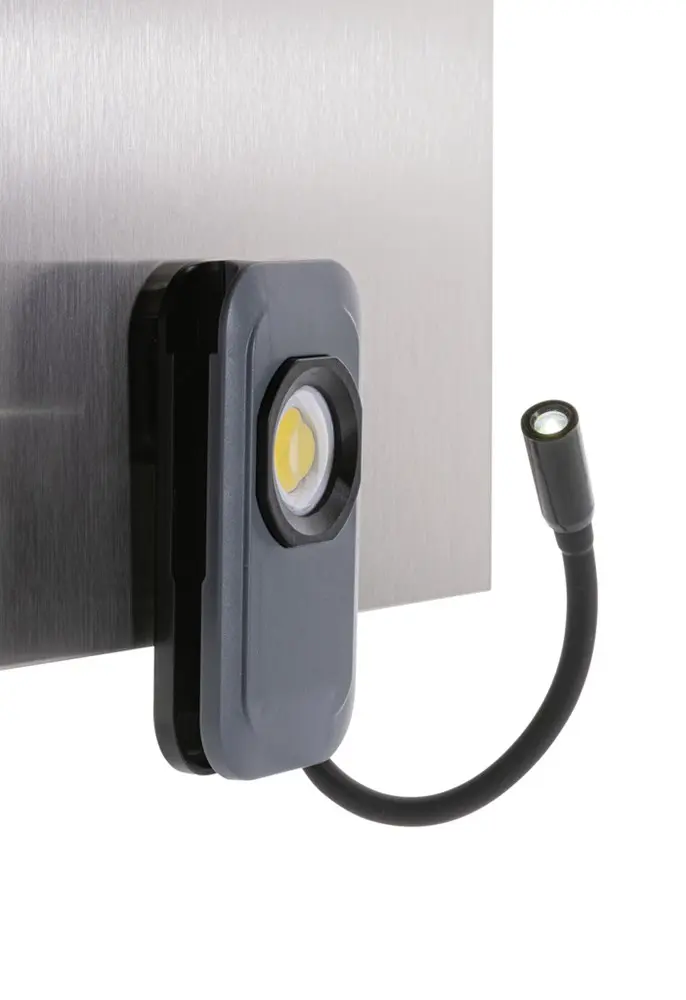 Équipée d'une batterie lithium rechargeable de 1000 mAh (classe A), elle offre jusqu'à 3 heures d'autonomie sans besoin de piles jetables. Profitez de 3 modes d'éclairage : LED extensible (80 lumens) pour une portée ajustable, COB (260 lumens) pour une lumière puissante, et COB 50 % pour une économie d'énergie. L'aimant arrière assure une fixation pratique sur les surfaces métalliques, parfaite pour les ateliers ou les interventions sur site.