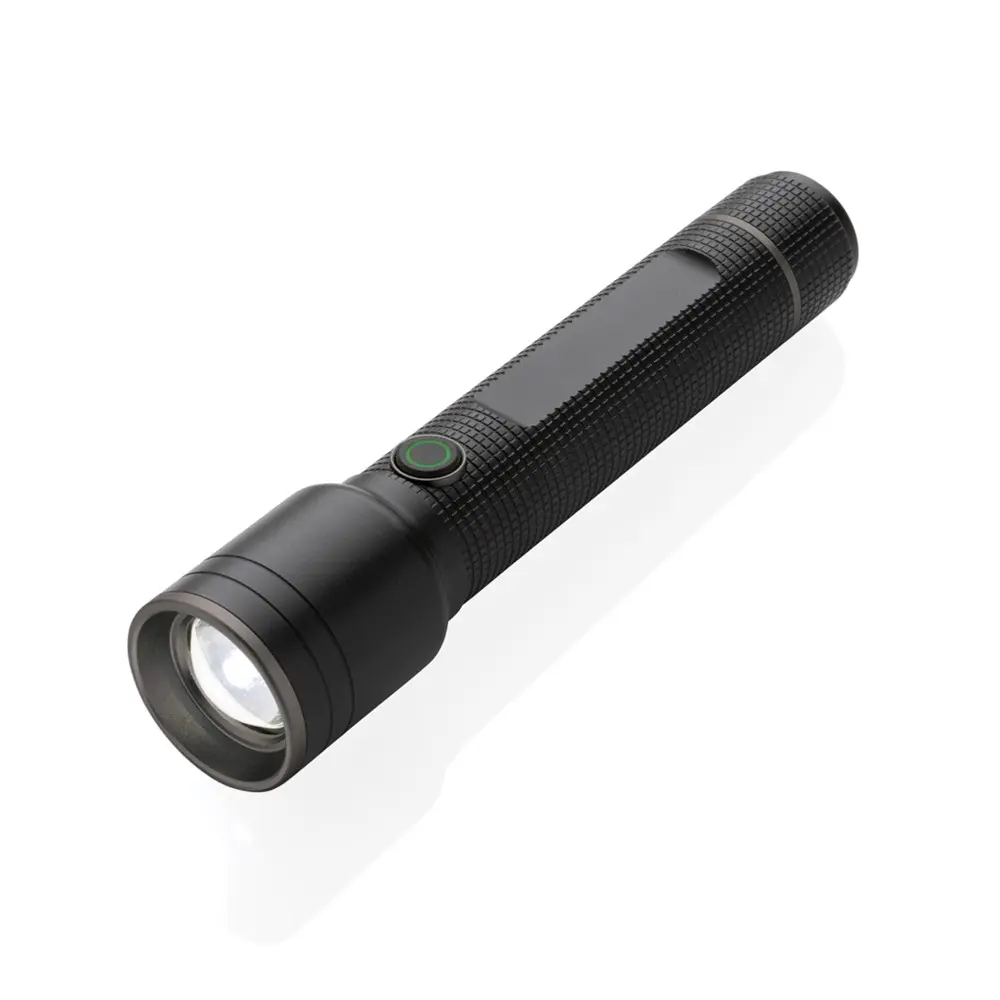 Découvrez notre lampe torche 10W rechargeable en aluminium recyclé certifié RCS, idéale pour les entreprises soucieuses de l'environnement. Avec 78 % de contenu recyclé, elle garantit une chaîne d'approvisionnement durable et recyclable à l'infini, sans PVC. Résistante aux intempéries grâce à son indice IPX4, elle produit 800 lumens et un faisceau atteignant 500 mètres, parfait pour les événements extérieurs.