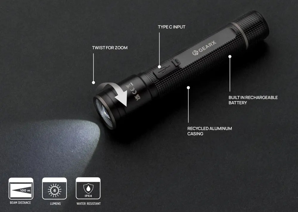 Équipée d'une LED Cree™ puissante (100 lumens, portée 100 m), elle offre 5 modes d'éclairage, dont SOS, et une batterie 500 mAh pour jusqu'à 4 heures d'autonomie. Rechargez-la via USB-C inclus (câble recyclé RCS) et utilisez-la comme powerbank pour charger vos appareils.