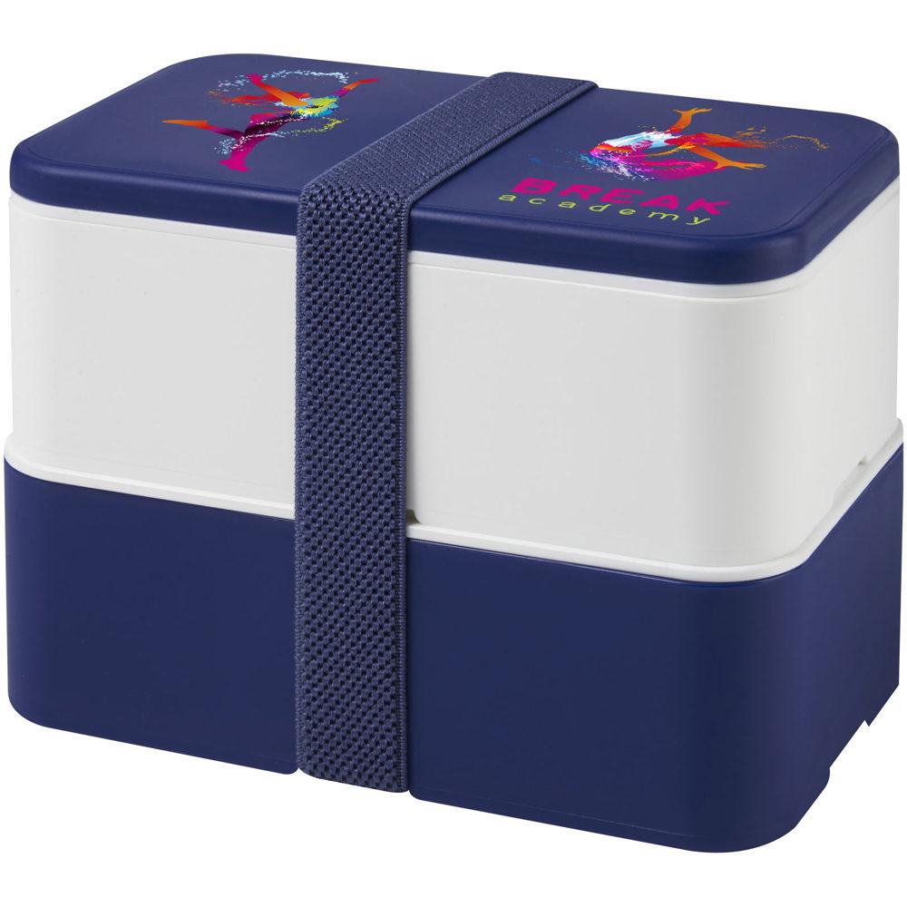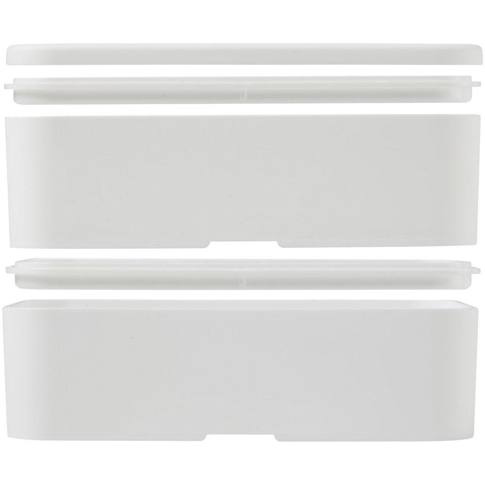 Découvrez la lunch box MIYO double couche, idéale pour vos campagnes promotionnelles et événements d'entreprise. Avec une capacité totale de 1400 ml répartie en deux blocs de 700 ml, elle offre un espace généreux pour transporter sandwiches, fruits, salades et plus encore, tout en maintenant les aliments en place grâce à un élastique en PET recyclé.