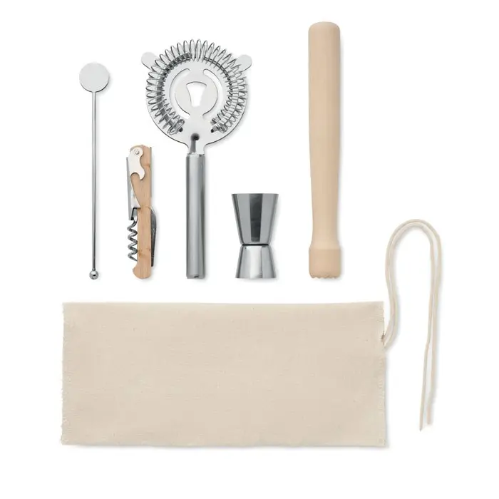 Découvrez ce kit cocktail complet, idéal pour impressionner vos clients lors d'événements ou comme cadeau promotionnel. Présenté dans une pochette en coton pratique avec fermeture par cordon, il contient cinq outils essentiels pour préparer des cocktails parfaits : un jigger double face (15 et 30 ml) pour des mesures précises, un mélangeur en bois robuste, une passoire à cocktail efficace, un agitateur et un limonadier pour une touche finale professionnelle. La pochette est fabriquée en coton 220 gr/m², durable et écologique.