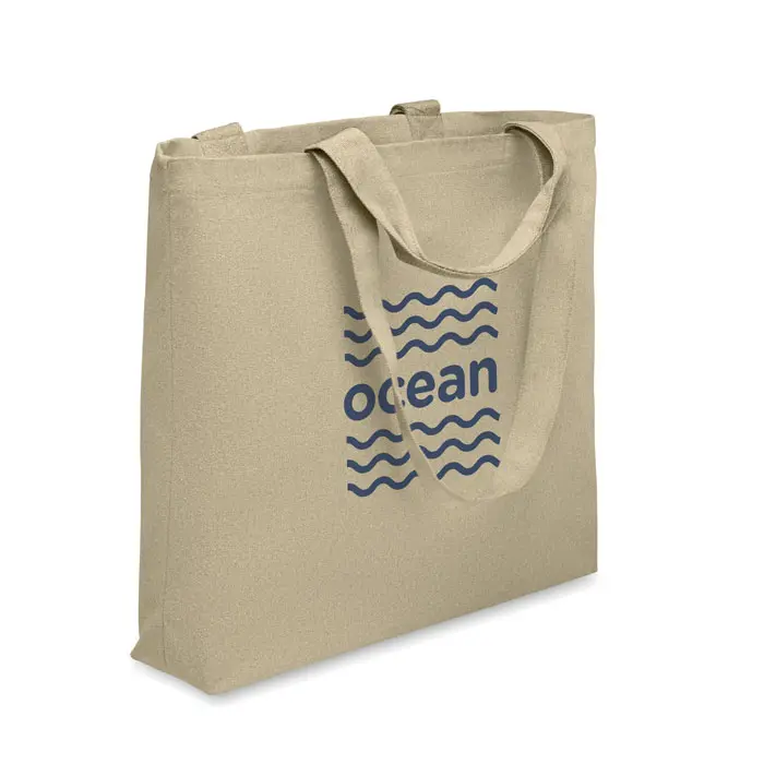 Découvrez notre sac de plage en toile de 320 gr/m², fabriqué à partir de tissus recyclés composés de 60% coton recyclé et 40% polyester recyclé. Ce modèle polyvalent sert à la fois de sac shopping et de sac de plage, équipé d'anses courtes et longues pour un transport facile et confortable.
