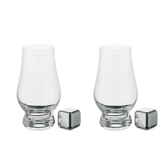 Offrez une expérience premium à vos clients avec ce set complet dédié à la dégustation de whisky ou d'autres spiritueux. Composé de deux verres de 200 ml en verre de qualité, deux glaçons réutilisables en acier inoxydable, une pince pour manipuler les glaçons et une pochette en coton pour leur rangement, il allie praticité et sophistication.