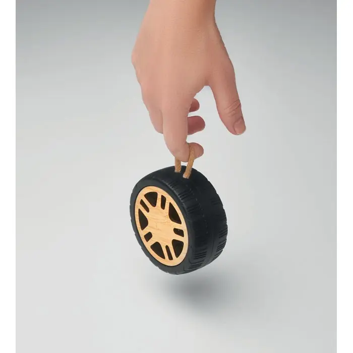 Découvrez le haut-parleur sans fil MATIC en forme de roue, idéal pour vos campagnes marketing et événements d'entreprise. Fabriqué en ABS recyclé avec des accents en bambou et une poignée en corde de coton, ce gadget éco-responsable allie durabilité et style naturel. Doté d'une puissance de 3W et d'une batterie rechargeable de 400 mAh, il offre une autonomie fiable pour diffuser votre musique préférée partout.