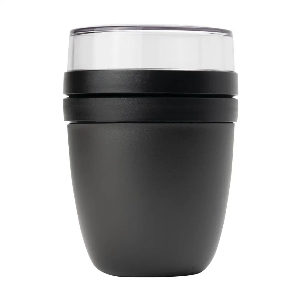 Découvrez le pot à déjeuner Mepal Ellipse 500 ml, un récipient alimentaire en plastique innovant et pratique, idéal pour transporter repas ou collations. Doté de deux compartiments séparables par un simple mouvement de torsion, il évite tout mélange intempestif grâce à des couvercles indépendants. Le compartiment supérieur transparent offre 200 ml de capacité, parfait pour 75 g de muesli ou fruits, tandis que le compartiment inférieur de 500 ml accueille généreusement soupe, nouilles ou yaourt.