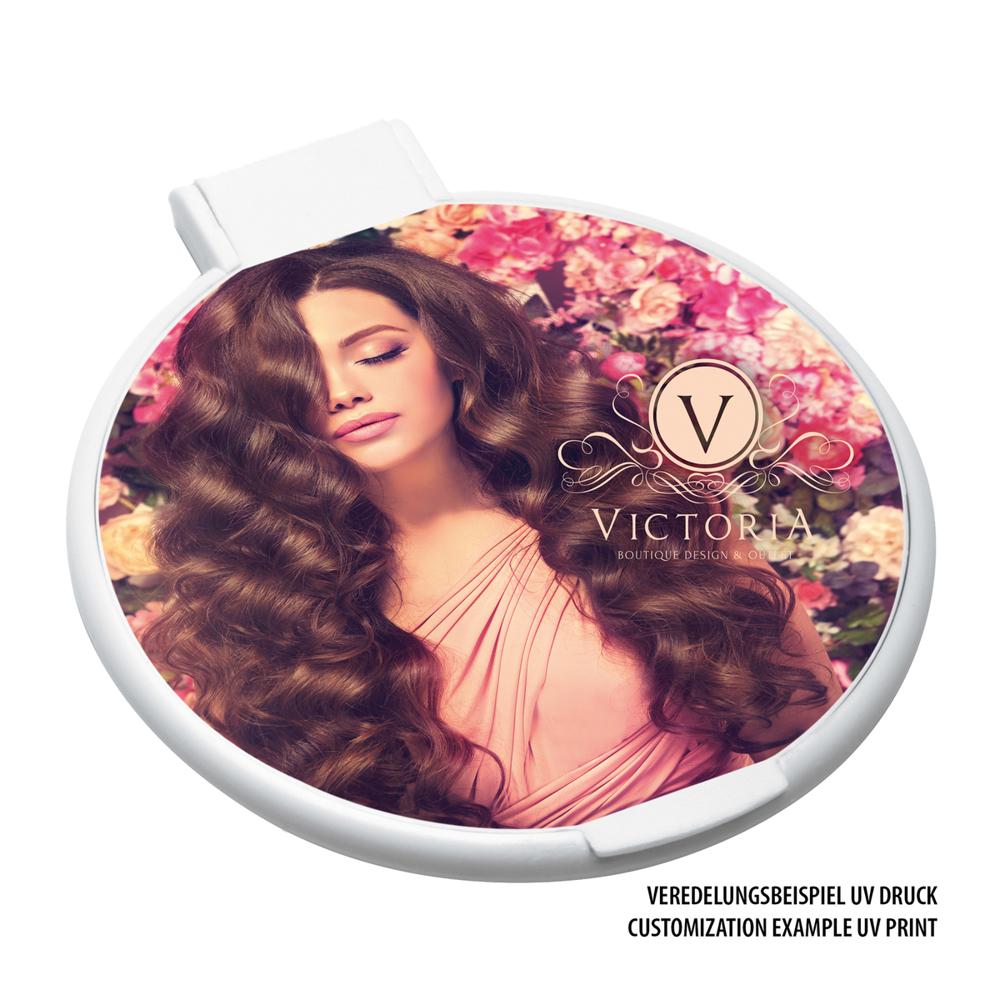 Ce miroir de poche compact et pratique s'insère facilement dans les trousses de toilette ou les sacs à main, captivant l'attention de vos clients au quotidien. Son design pliable protège le miroir des chocs et rayures grâce à la partie supérieure qui se referme hermétiquement. Personnalisez entièrement la surface extérieure avec votre logo pour une visibilité optimale : optez pour une impression UV intégrale, du doming ou une impression tampographie en une à quatre couleurs.