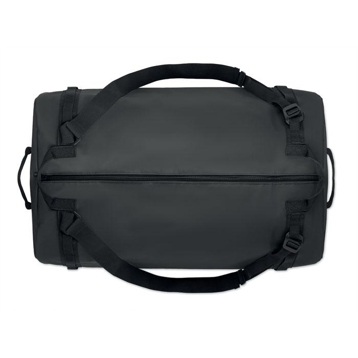 Découvrez le MOUNTAIN - Sac de voyage en tarpaulin, un grand sac polyvalent idéal pour le sport, les voyages ou en mode sac à dos. Fabriqué en tarpaulin 50C résistant et imperméable, il dispose d'un compartiment intérieur zippé pour organiser vos affaires en toute sécurité, d'une bandoulière détachable et réglable pour un port confortable, et d'une doublure en RPET recyclé pour un engagement éco-responsable.