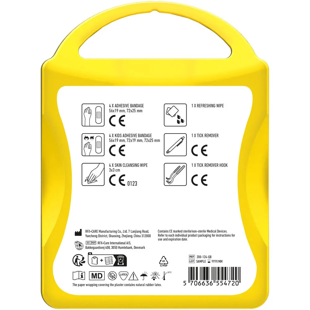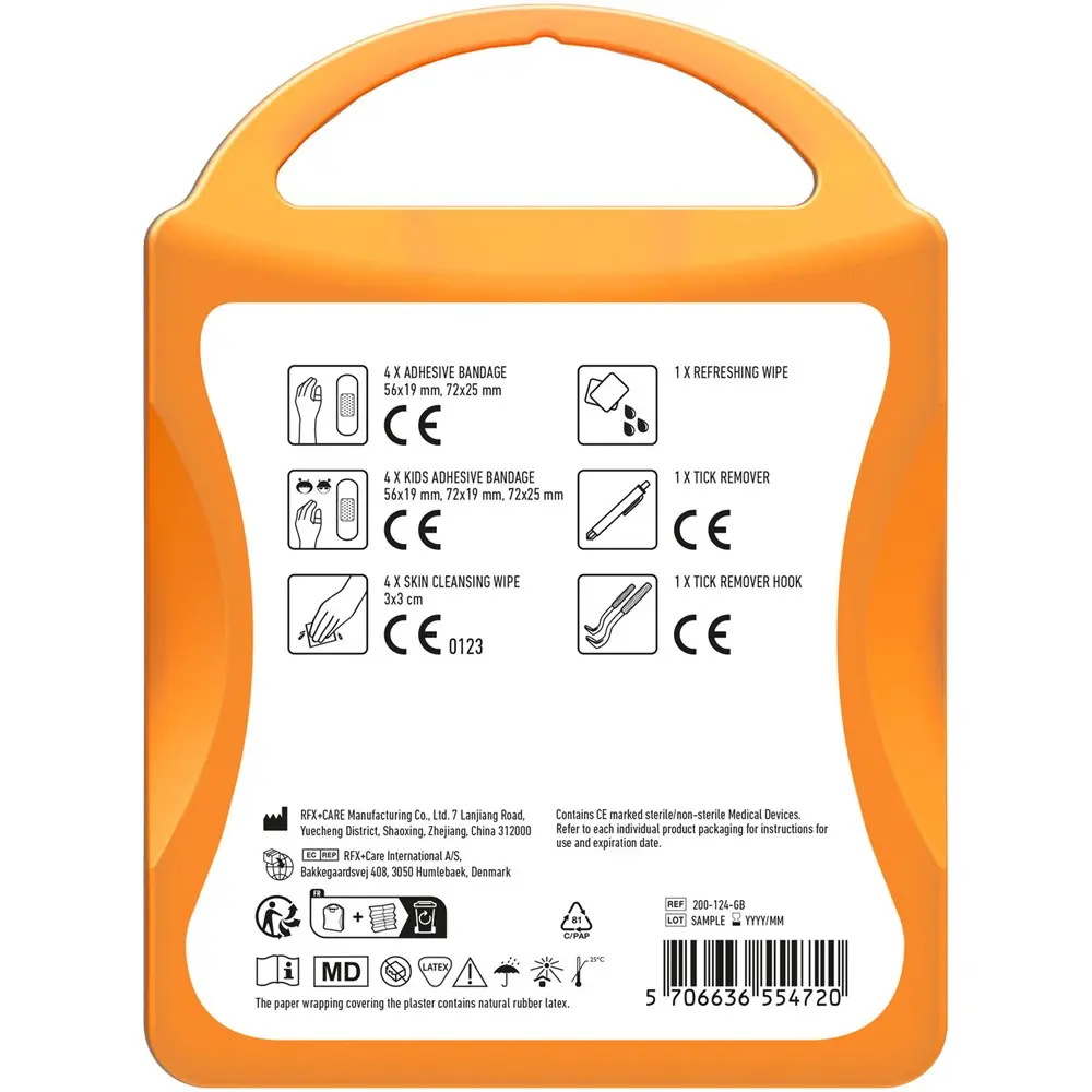 Ce kit compact (10 x 13,4 x 3 cm) en plastique durable, fabriqué en Europe, contient tout le nécessaire : 4 pansements standards et 4 pour enfants, 4 cotons pour nettoyer la peau, un retire-tiques pour humains et un à crochet pour une extraction facile et hygiénique, plus une lingette rafraîchissante. Tous les composants respectent les normes européennes pour une qualité irréprochable.