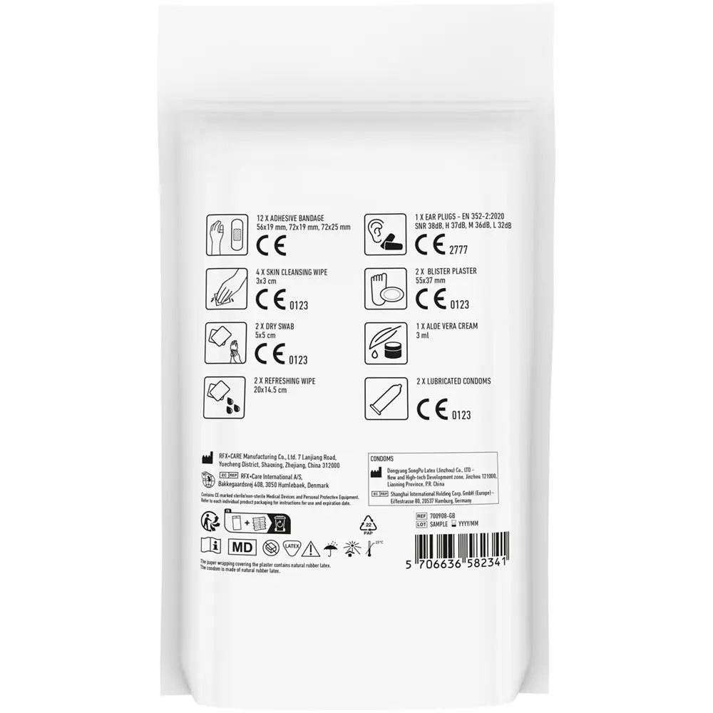 Ce kit contient 12 pansements, 4 cotons nettoyants pour la peau, 2 cotons secs, 2 lingettes rafraîchissantes, 2 préservatifs, 2 pansements supplémentaires, 1 crème à l'aloe vera et 2 bouchons anti-bruit. Tous les éléments respectent les normes européennes pour une sécurité optimale.