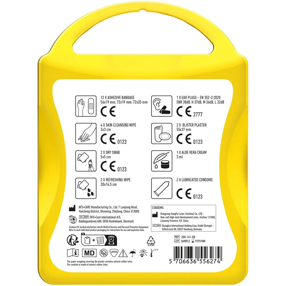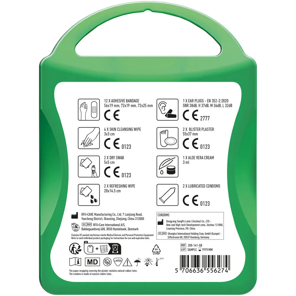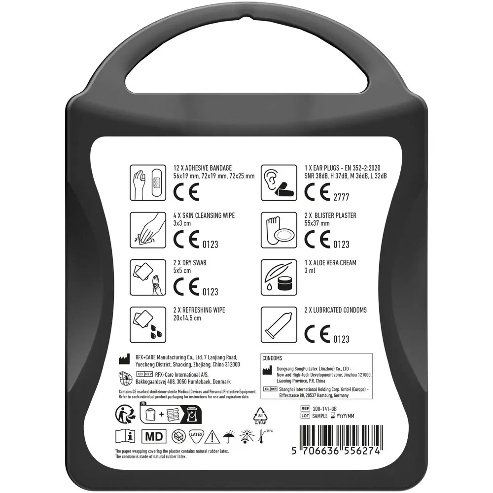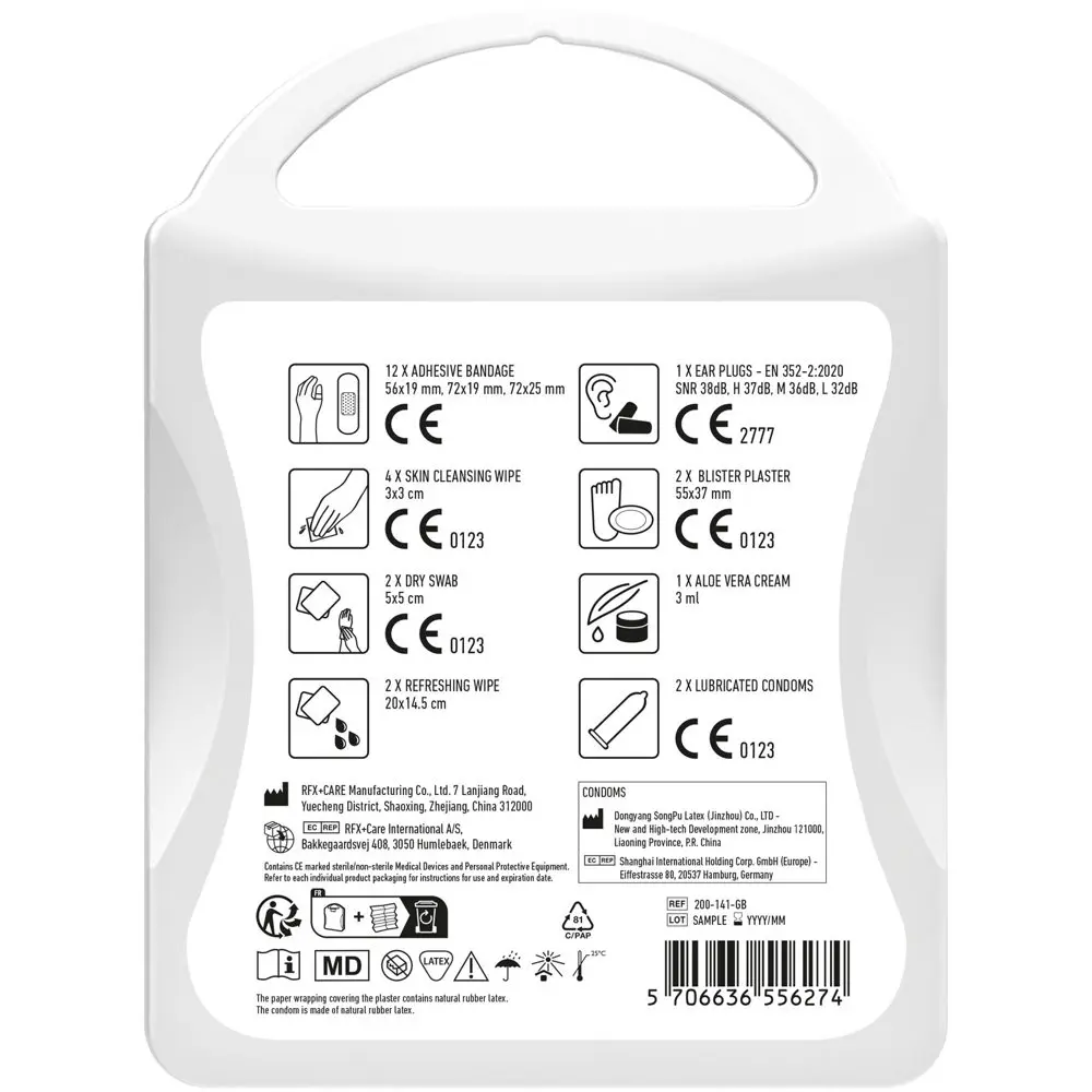 Ce kit contient 12 pansements, 4 cotons nettoyants, 2 cotons secs, 2 lingettes rafraîchissantes, 2 préservatifs, 2 pansements supplémentaires, 1 crème à l'aloe vera et 2 bouchons anti-bruit. Tous les éléments respectent les normes européennes pour une sécurité optimale.