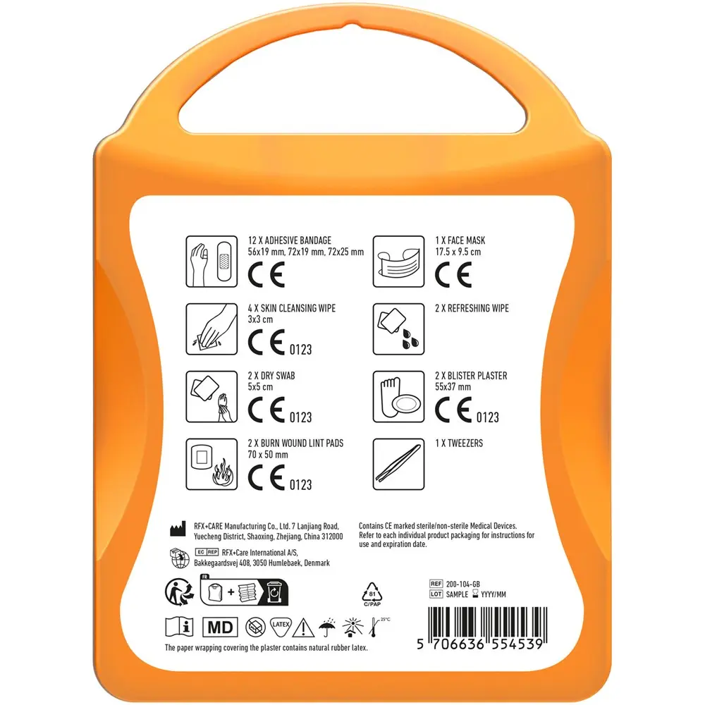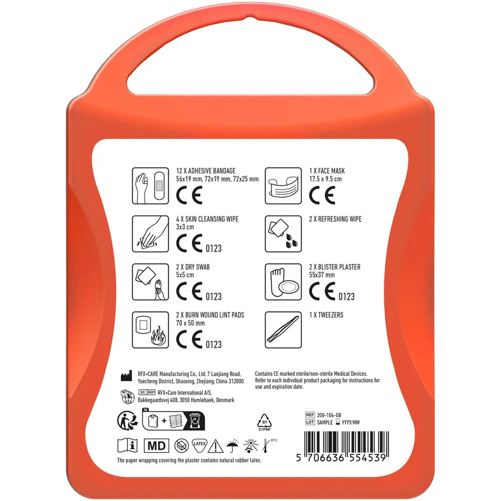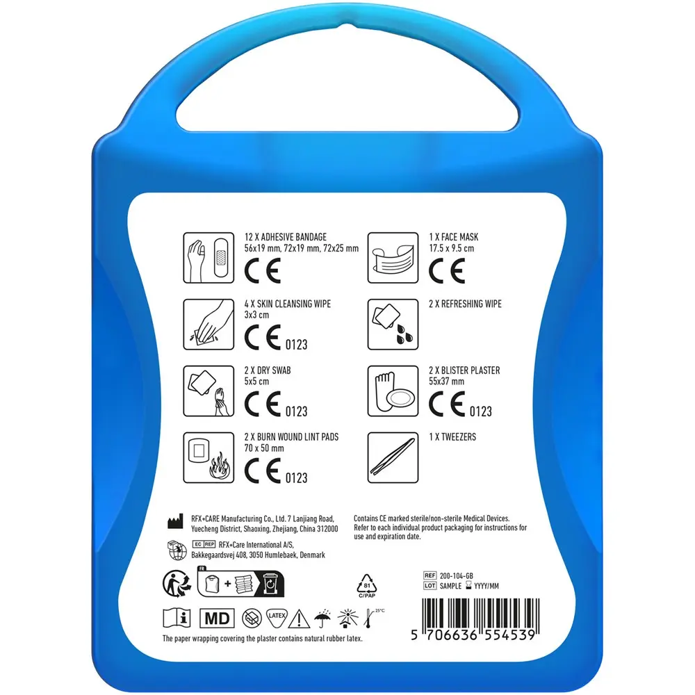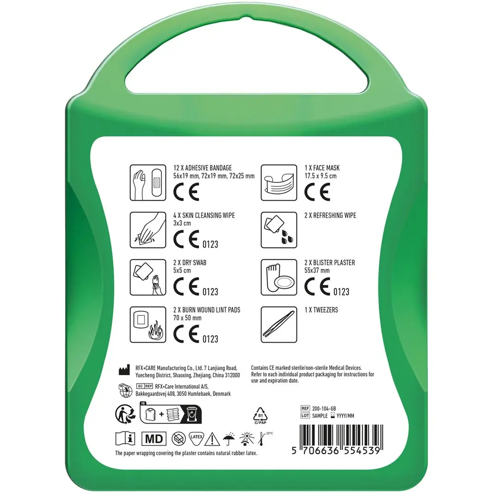Il contient : 12 pansements, 4 cotons nettoyants pour la peau, 2 cotons secs, 1 masque, 2 pansements supplémentaires, 4 compresses pour brûlures et 1 pince à épiler. Tous les éléments respectent la législation européenne, garantissant conformité et fiabilité.