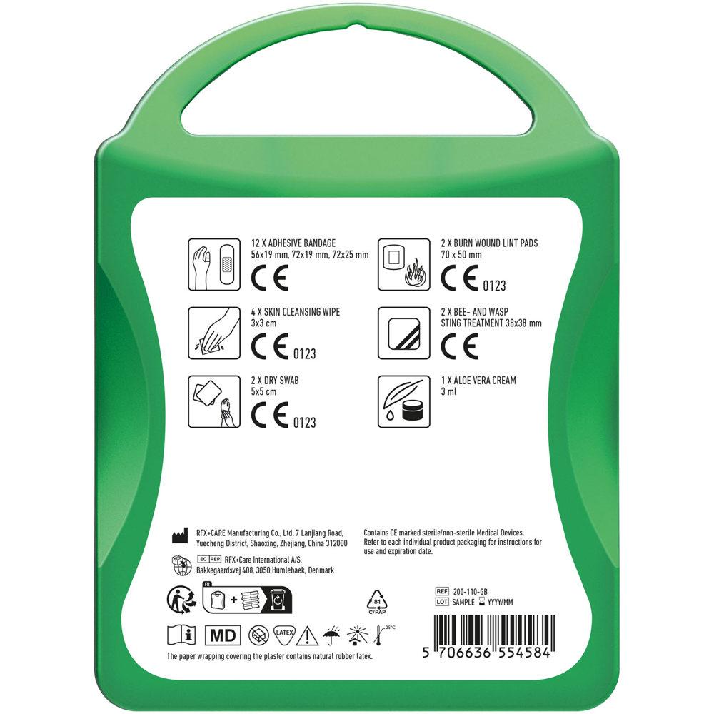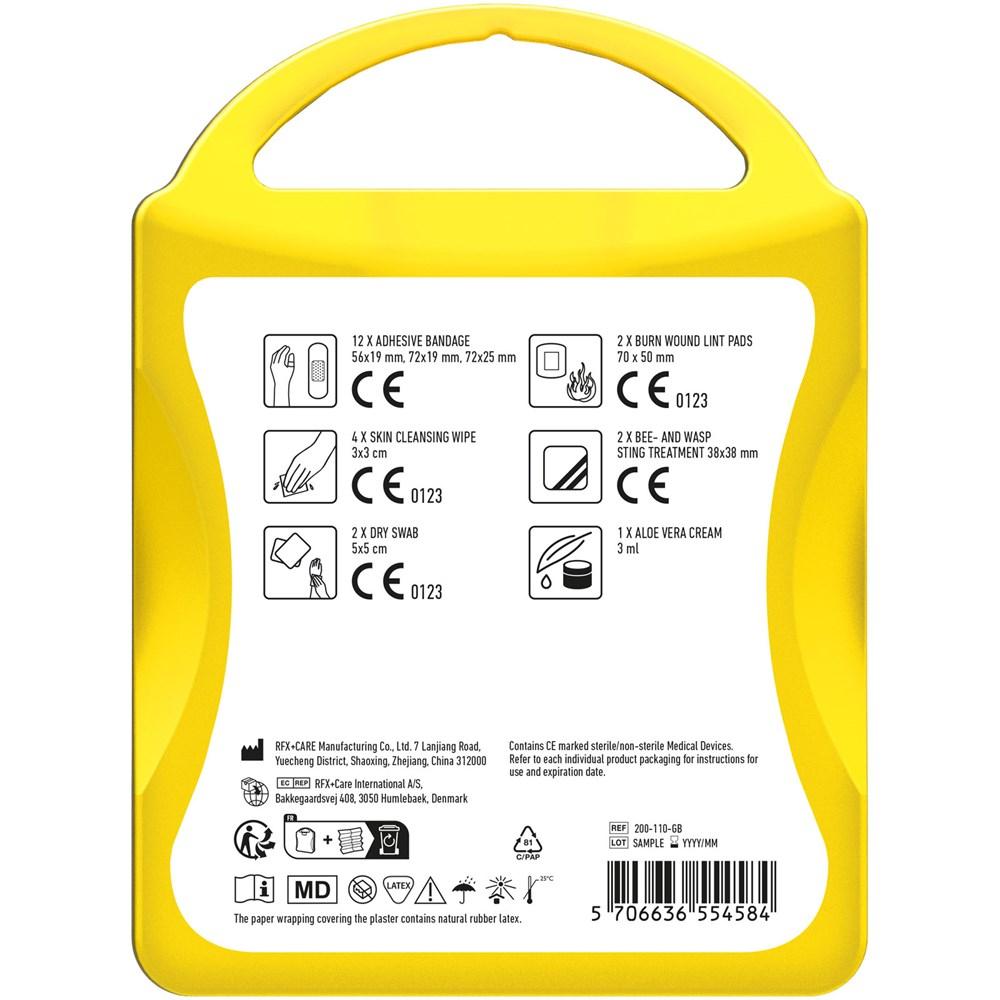 Ce kit compact contient : 12 pansements, 4 cotons pour nettoyer la peau, 2 cotons secs, 2 compresses pour les brûlures, 1 patch pour les piqûres d'abeilles et 1 crème à l'aloe vera. Tous les produits intérieurs respectent scrupuleusement la législation européenne, garantissant qualité et sécurité optimale.